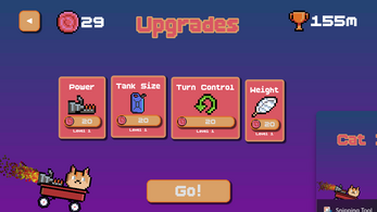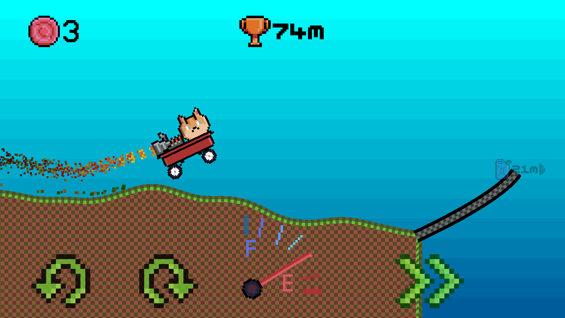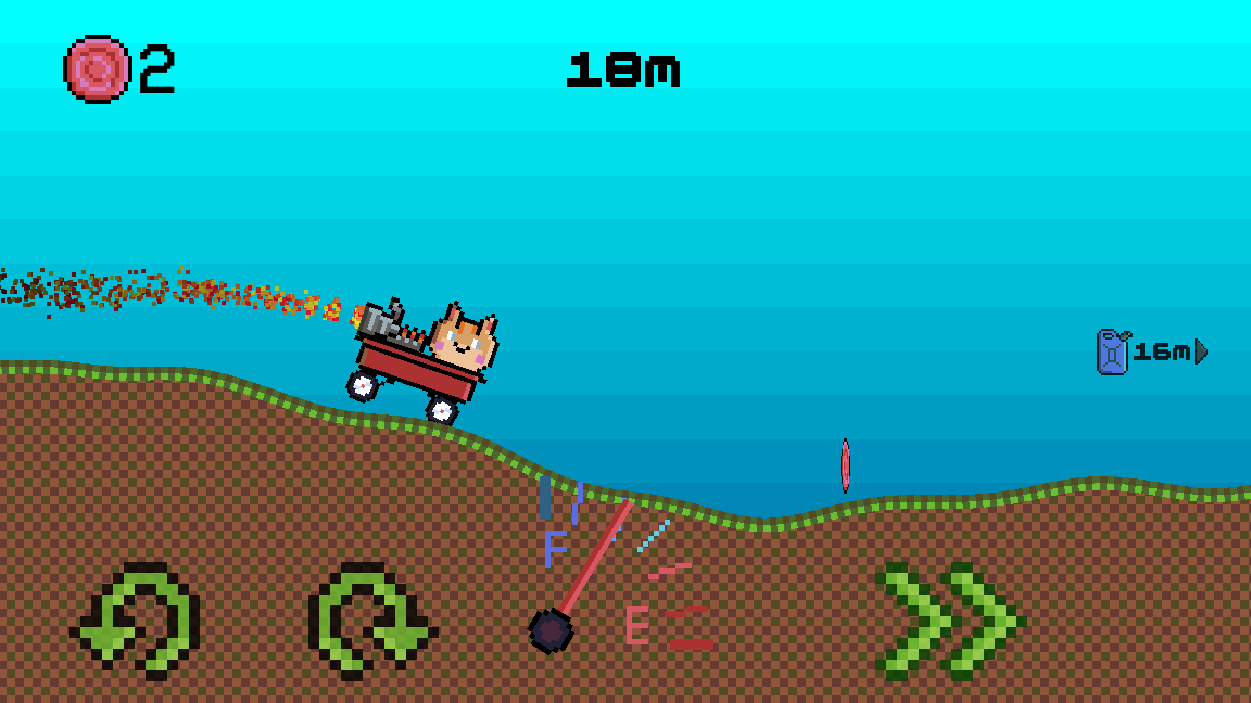 A cat in a rocket-powered wagon. What could go wrong... Drive an overpowered toy wagon, piloted by a cat. Go as far as you can without crashing or running out of gas. Upgrade your machine by collecting coins, but keep it balanced, or you'll have some unexpected results...